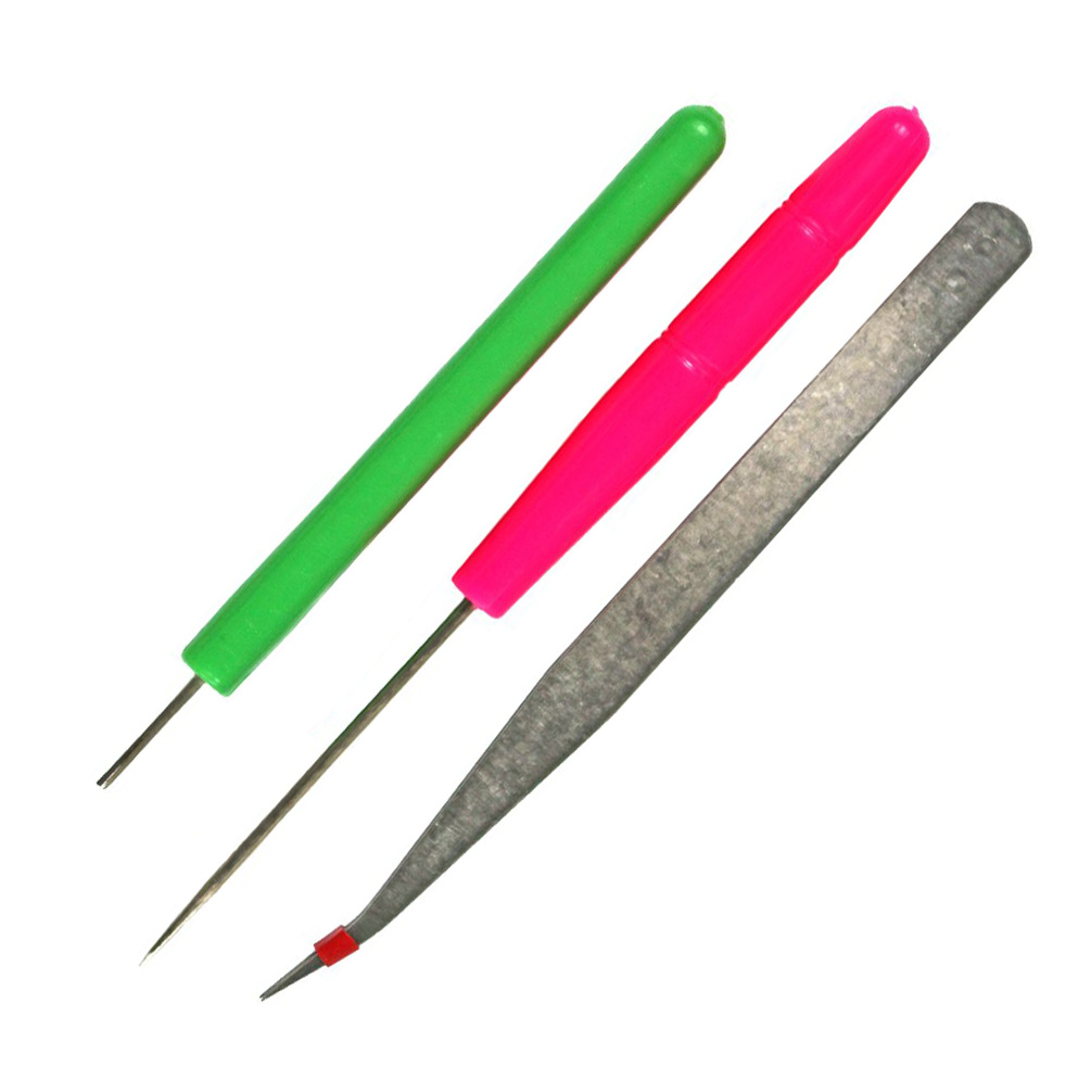 Dieser Satz Quilling-Werkzeuge besteht aus einer 11 cm langen Nadel mit Kunststoffgriff, einem 14 cm langen Spieß und einer Metallpinzette mit gebogener Spitze: 13,2cm.