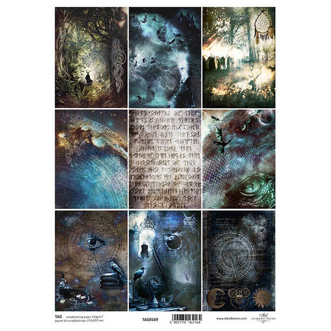 Papier do scrapbookingu A4 - księzyc, smoki, niebo, alchemia, kruki, jelenie, celtyckie napisy, runy, galaktyka, oko smoka