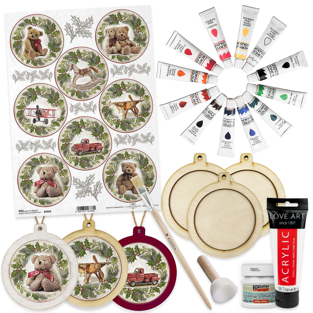 Zestaw startowy do decoupage świąteczny - drewniane bombki z zabawkami