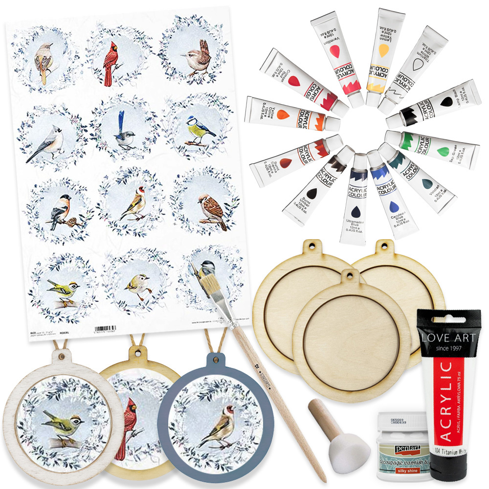 Zestaw startowy do decoupage świąteczny – drewniane bombki z ptakami