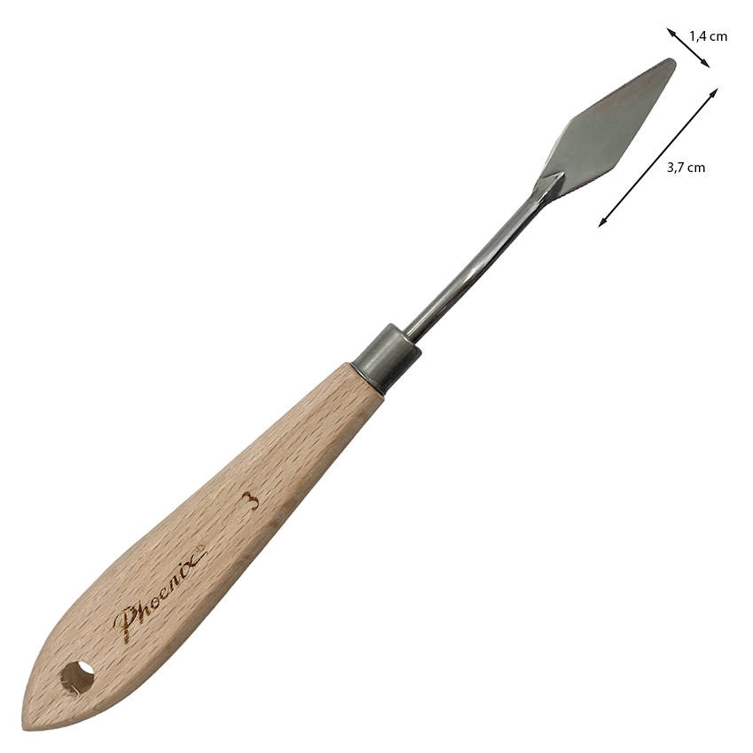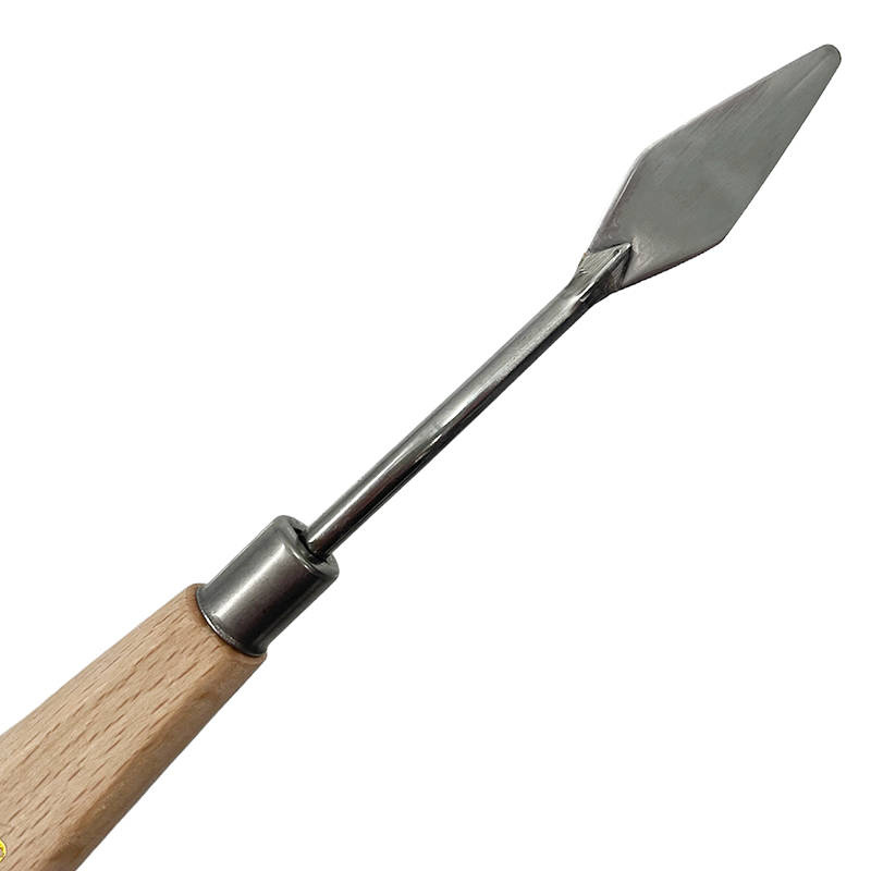 Posiada profilowaną drewnianą rączkę o długości 10cm oraz metalową, sprężystą końcówkę o wymiarach 37 x 14 mm.