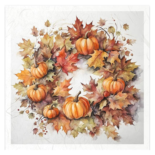 Zestaw sześciu ilustracji przedstawiających bogato zdobione jesienne wieńce z dyniami, liśćmi i owocami. Kompozycje w naturalnych, nasyconych barwach oddają przytulny i dekoracyjny charakter jesieni. Idealne do jesiennych projektów DIY, scrapbookingu, kartek i ozdób w stylu retro lub country.