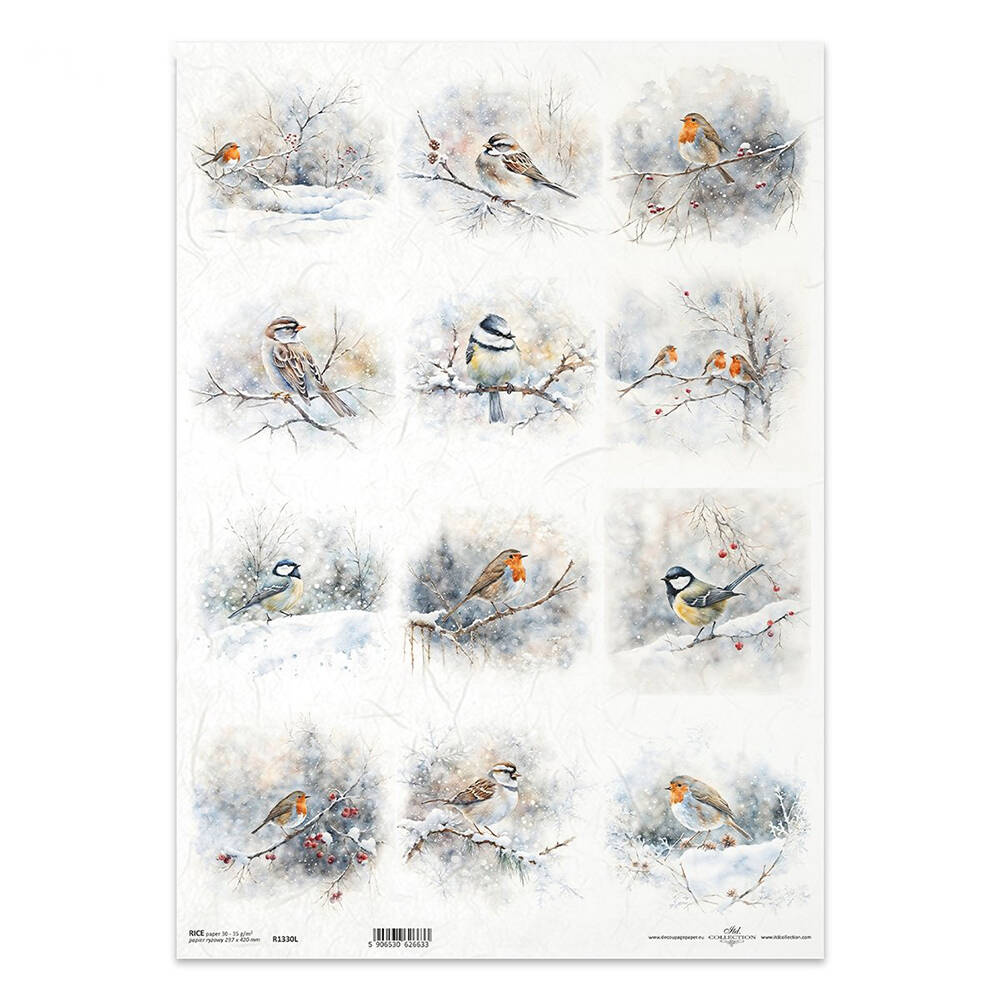 Papier ryżowy do decoupage A3 - zimowe ptaki, rudzik, sikorka, wróbel - R1330L - Itd Collection