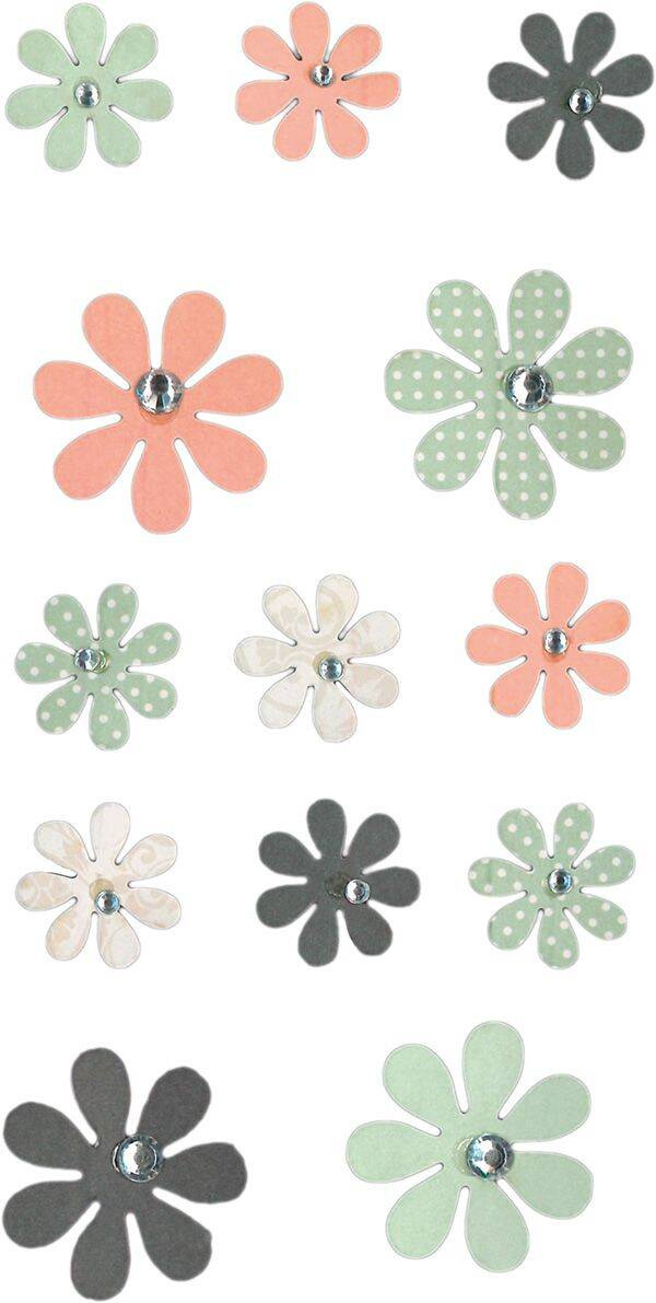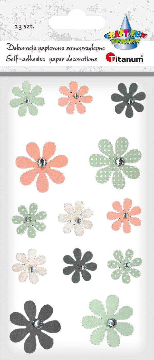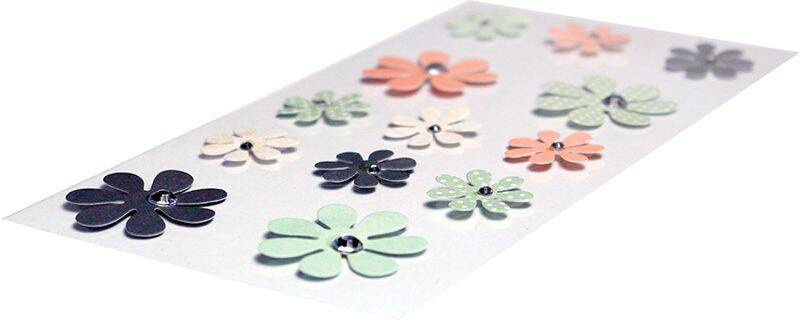 Naklejki dekoracyjne papierowe o wzorze kwiatów z kryształkami umieszczone na blistrze zawierającym 13 sztuk nadadzą wielu projektom perfekcyjne wykończenie.