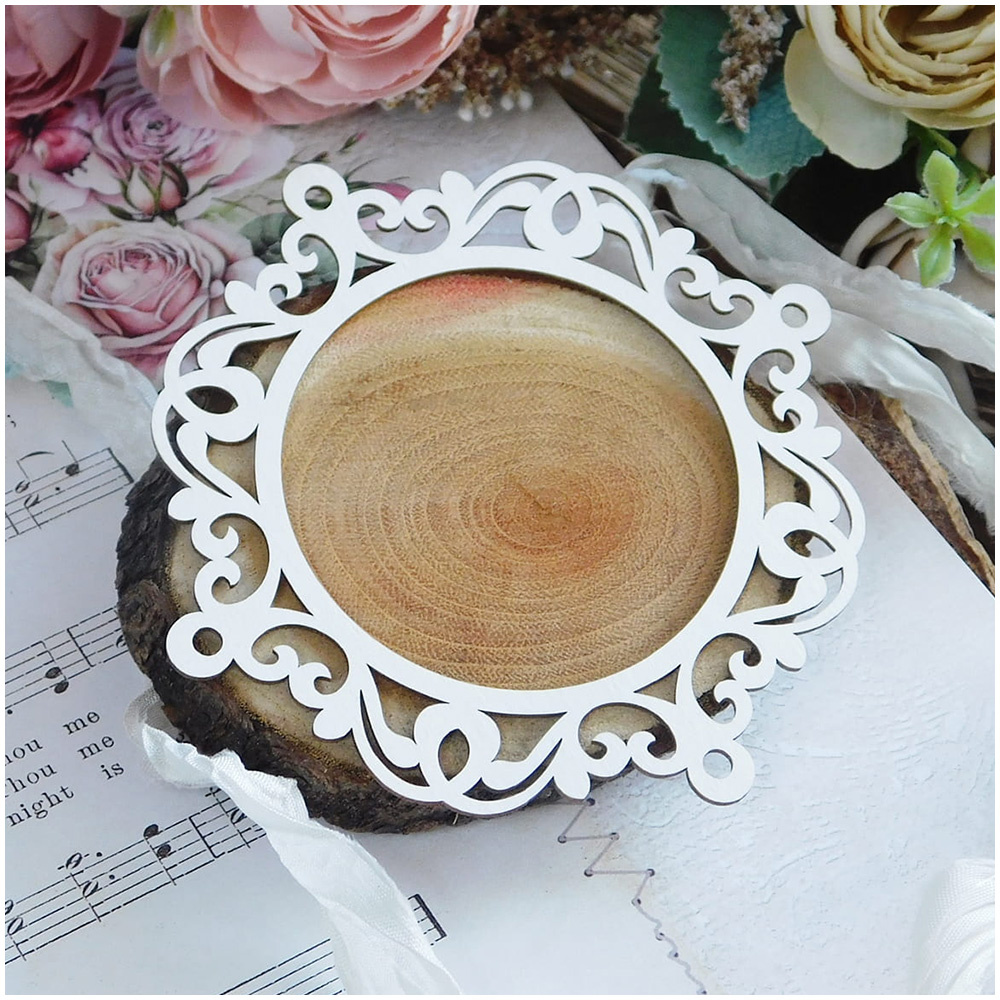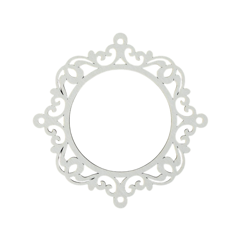 Elegancki element dekoracyjny w formie ramki ażurowej, wykonany z jasnej tektury o grubości 1,2 mm.