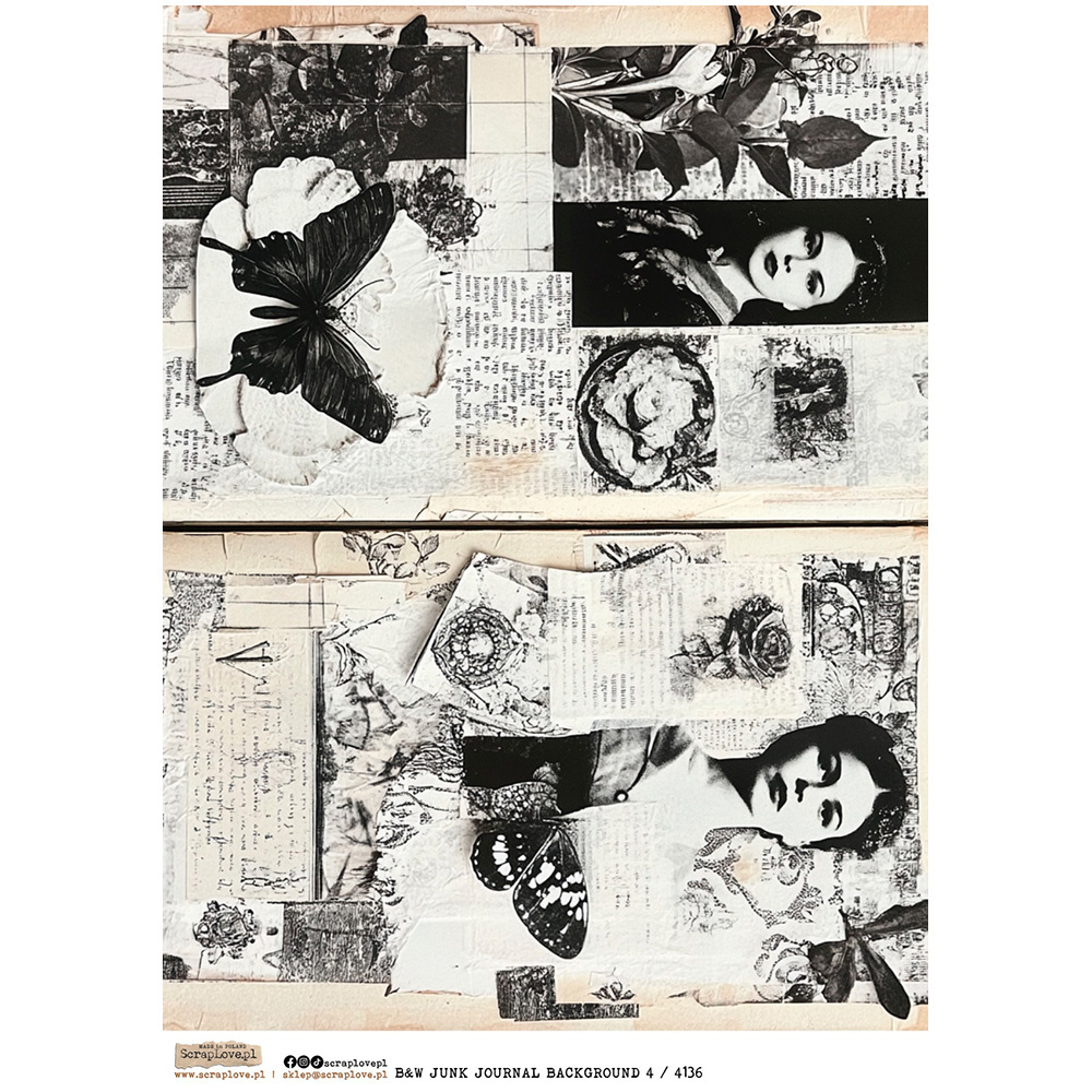 Papier ryżowy A4 - Scraplove - B&W Junk Journal Background 4 kobiety retro motyl