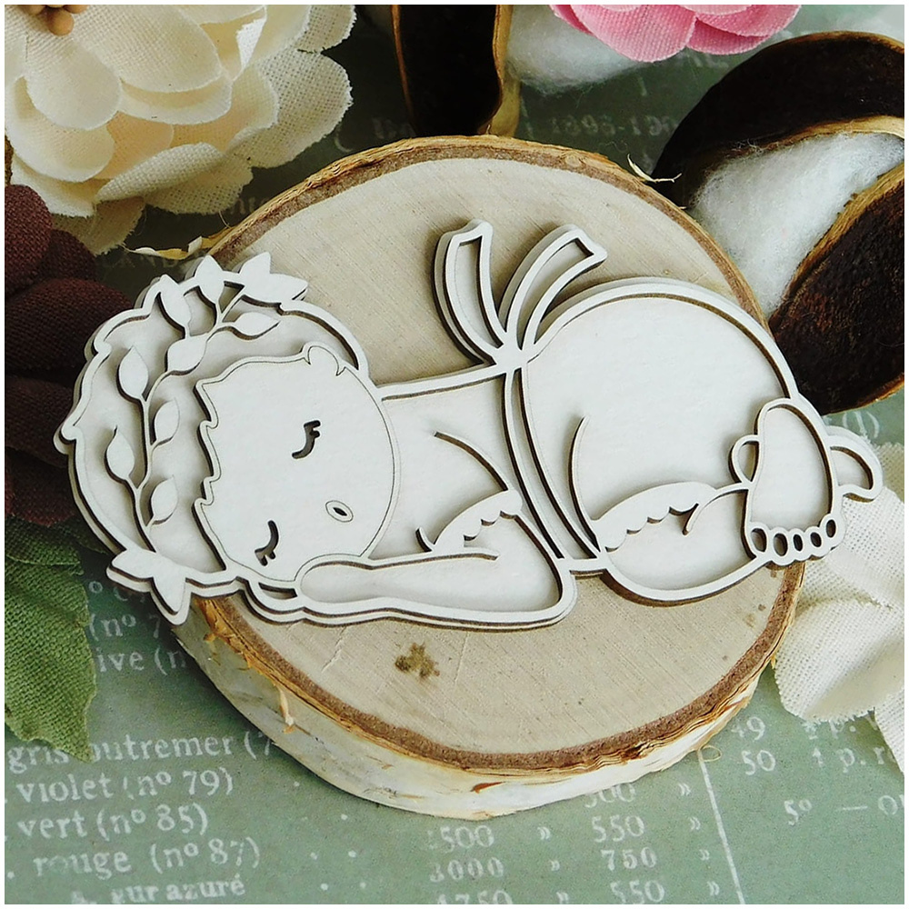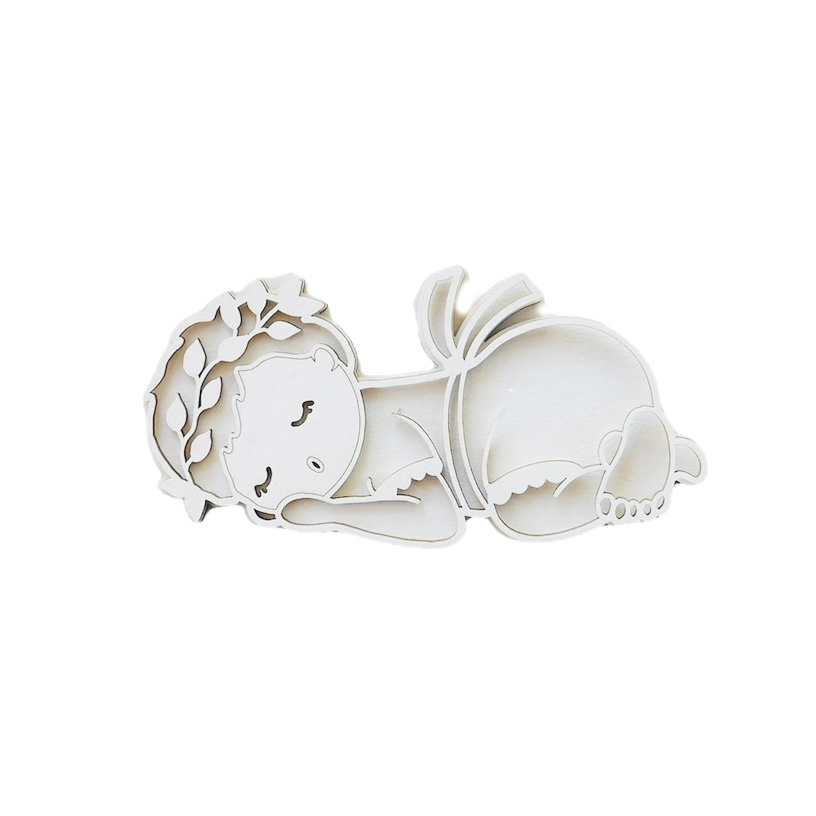 Elegancki, warstwowy element dekoracyjny w formie śpiącego dziecka, wykonany z jasnej tektury o grubości 1,2 mm.