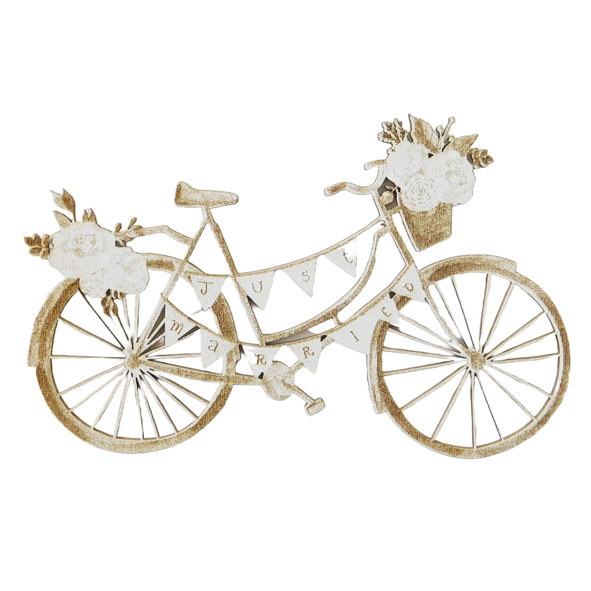 Elegancki element dekoracyjny w formie roweru z napisem Just married, wykonany z jasnej tektury o grubości 1,2 mm.