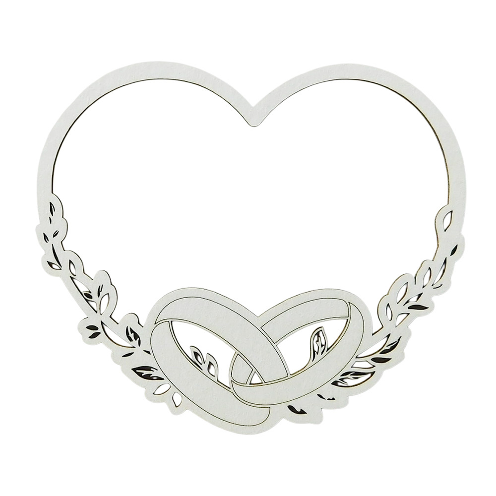 Elegancki element dekoracyjny w formie ramki w kształcie serca z obrączkami, wykonany z jasnej tektury o grubości 1,2 mm.
