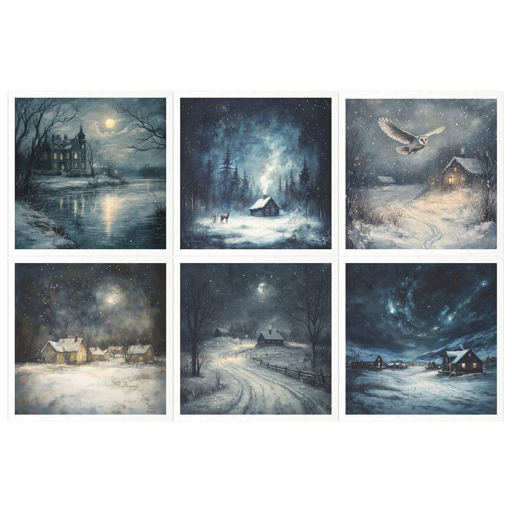 W tym zestawie znajdziesz sześć nastrojowych grafik inspirowanych zimowym, leśnym krajobrazem nocą: zaśnieżone wioski, sowę, niebo pełne gwiazd, zimowy zamek oraz spokojną zimową przyrodą. Każdy z motywów emanuje delikatnością i subtelnym urokiem chłodnej zimy - świetny do tworzenia klimatycznych kartek, dekoracji, tagów.
