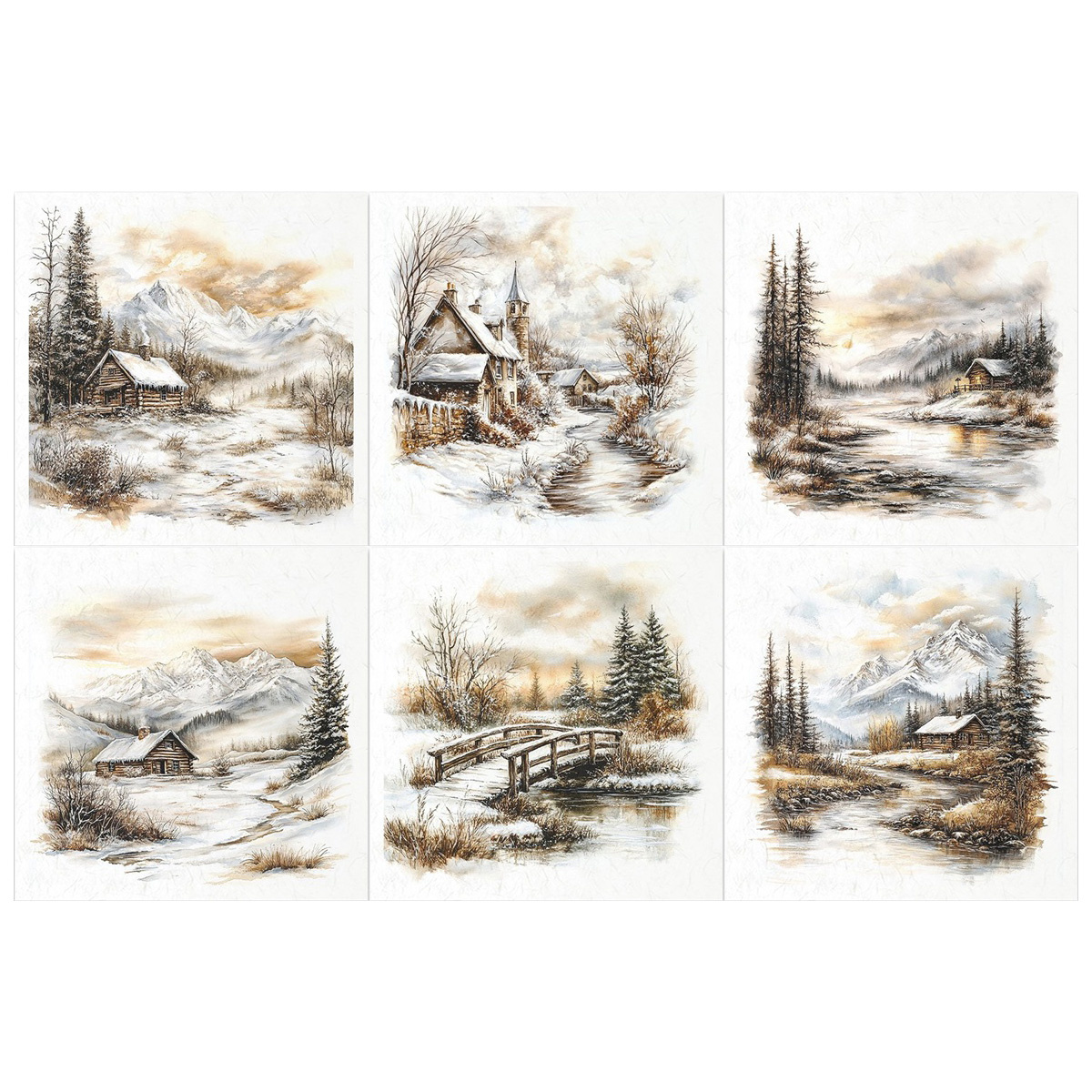W tym zestawie znajdziesz sześć subtelnych grafik przedstawiających zimowy krajobraz: góry, mostek, natura, domki, widoczki, drzewa iglaste. Te urokliwe ilustracje tworzą spokojną, magiczną atmosferę - od świątecznych dekoracji po zimowe kartki okolicznościowe.