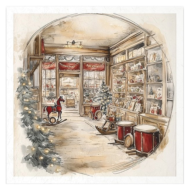 W tym zestawie znajdziesz sześć subtelnych grafik przedstawiających świąteczne motywy: sklep z zabawkami, Święty Mikołaj, kolejka, witryna sklepowa, zabawki, pociąg, lokomotywa, prezenty. Te urokliwe ilustracje tworzą spokojną, magiczną atmosferę - od świątecznych dekoracji po zimowe kartki okolicznościowe.