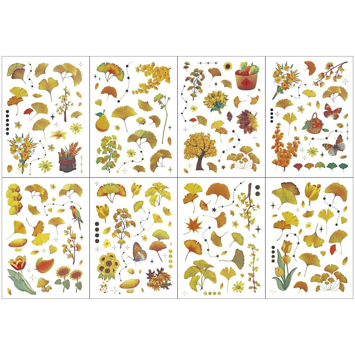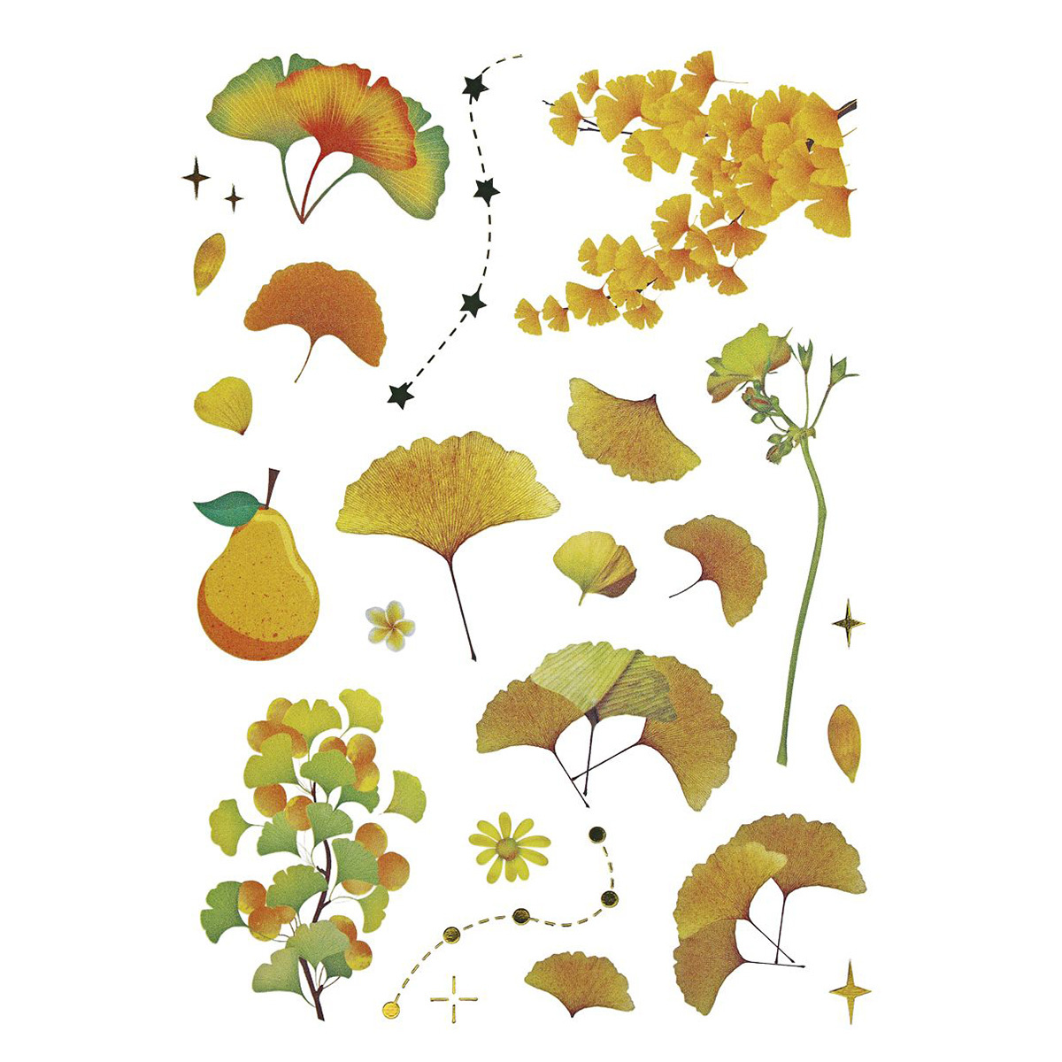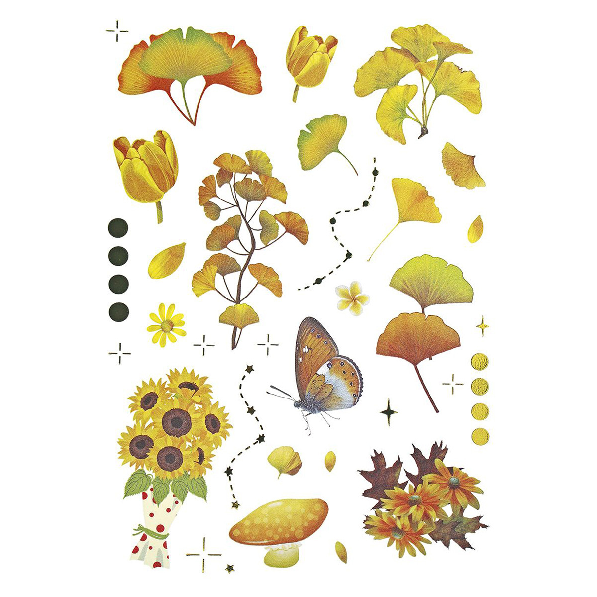 Naklejki foliowe z motywem kwiatów, liści, owoców i warzyw.