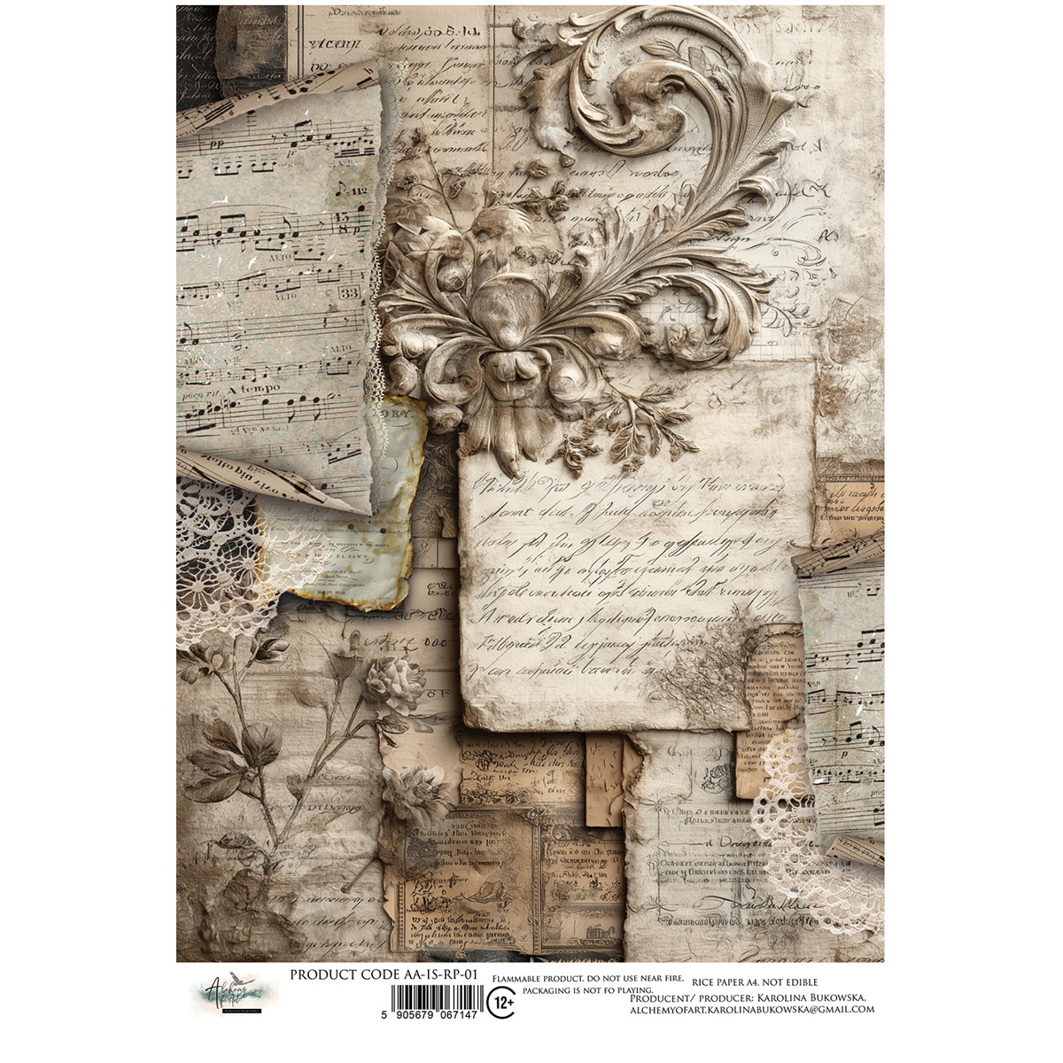 Papier ryżowy do decoupage A4 - Art of Alchemy - W ciszy, pismo, nuty