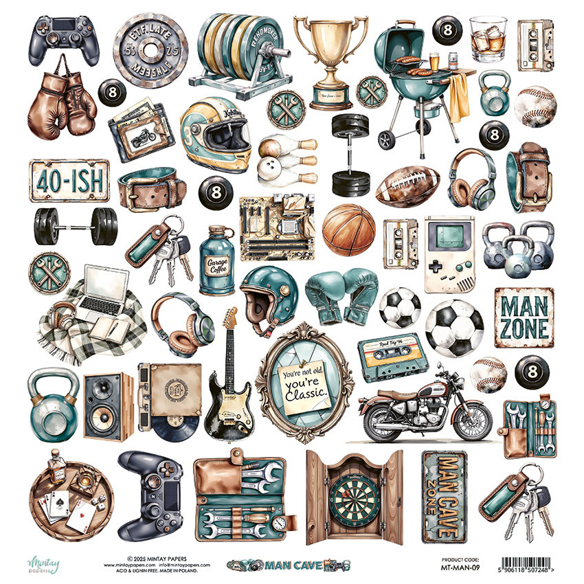 Man Cave to kolekcja o wyraźnie męskim charakterze, inspirowana pasjami, chwilami refleksji oraz osobistymi przestrzeniami, które mężczyźni lubią najbardziej. Stonowana kolorystyka, wyraziste faktury oraz motywy związane z muzyką, mechaniką, sportem, narzędziami i momentami relaksu. Idealna do albumów, kartek i layoutów dla mężczyzn w każdym wieku, a w średnim szczególnie.