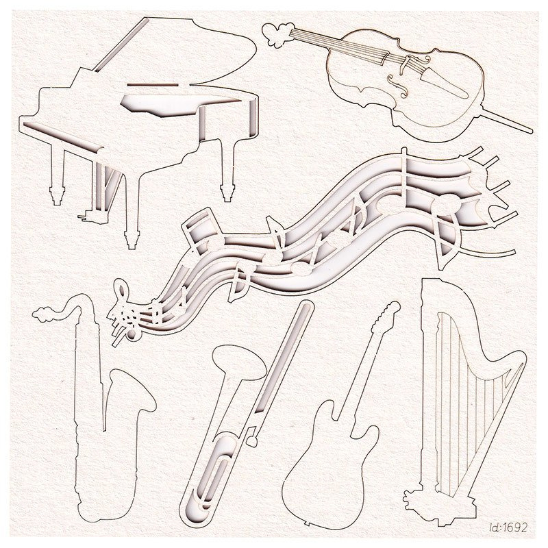- Zestaw złożony z pięciolinii i kilku instrumentów w arkuszu 14x14 cm. Wykonany z białej tekturki 1,2 mm.